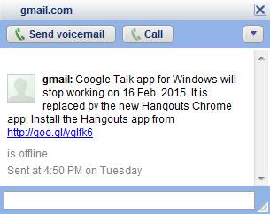 The company is shutting down its Gtalk service on February 16, which will be replaced by Hangouts. Google declared the same via chat saying that Google Talk app for Windows will go non-functional on February 16, 2015 and users can download Hangouts Chrome feature to continue chatting.